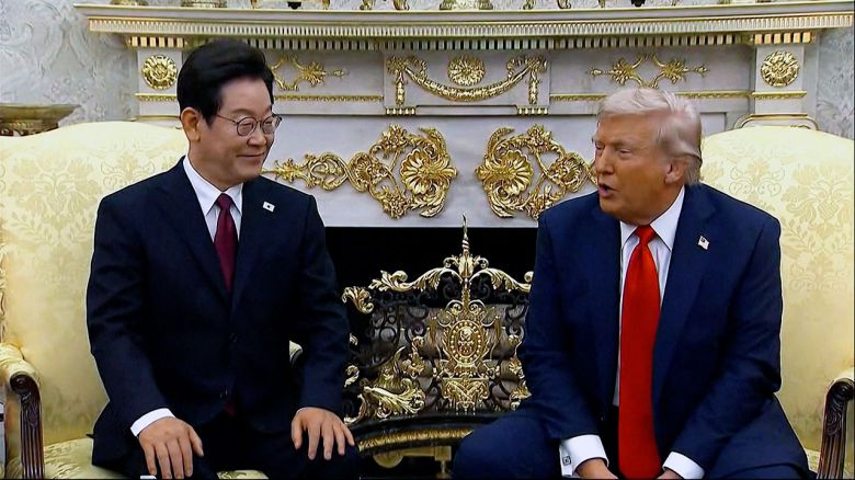백악관에 도착한 이재명 대통령이 마중 나온 트럼프 미국 대통령과 인사합니다.
