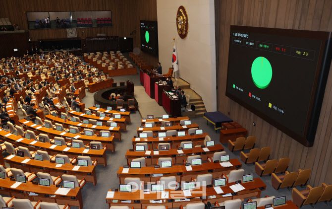 25일 오전 서울 여의도 국회에서 열린 제428회 국회(임시회) 제2차 본회의에서 상법 일부개정법률안이 재석 182인, 찬성 180인, 반대 0인, 기권 2인으로 가결되고 있다.(사진=노진환 기자)