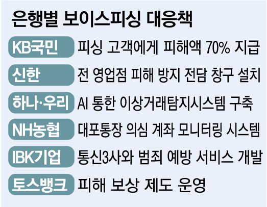 KB국민은행은 KB스타클럽 고객 중 보이스피싱으로 인한 피해가 발행하면 보상하는 무료 보험을 신청.가입한 고객에 한해 최대 1000만원 한도내에서 70%를 지급하는 제도를 도입했다. 하나은행은 ‘하나원큐’ 애플리케이션(앱)에 보이스피싱 앱 탐지 기능을 탑재해 월평균 1000건 이상의 피해를 사전에 막고 있는데 최근엔 AI 기반 이상거래탐지시스템(FDS)을 대폭 강화했다.