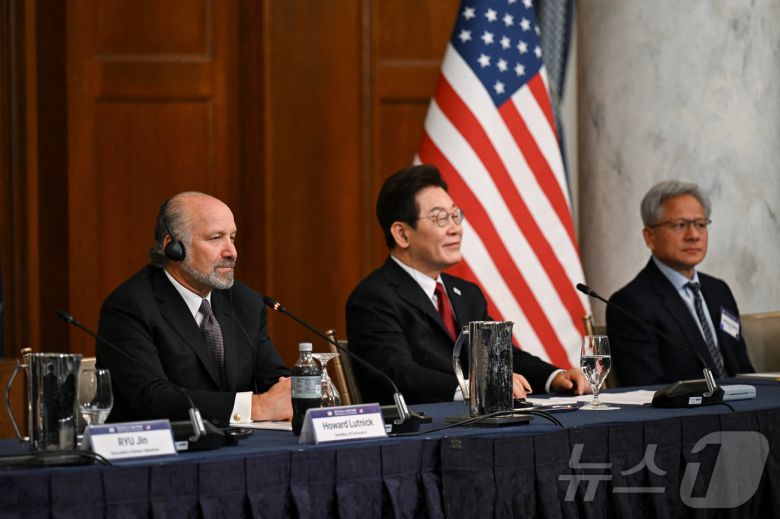 이재명 대통령이 25일(현지시간) 미국 워싱턴DC 윌라드 호텔에서 열린 한미 비즈니스 라운드 테이블에서 발언하고 있다. 왼쪽부터 하워드 러트닉 미국 상무장관, 이 대통령, 젠슨 황 엔비디아 최고경영자. ⓒ 로이터=뉴스1 ⓒ News1 신웅수 기자 |