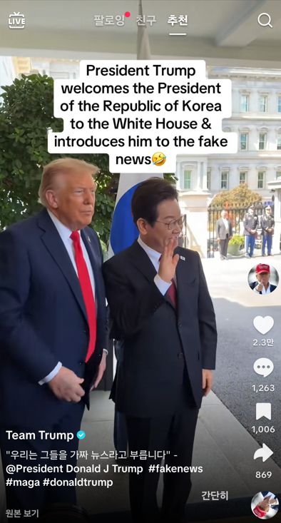 25일(현지시간) 팀 트럼프(Team Trump·2024 트럼프 재선 캠페인을 위해 운영된 공식 틱톡 계정)는 이같은 영상을 전하며 ‘트럼프 대통령이 대한민국 대통령을 백악관에 환영하며, 그를 가짜 뉴스 언론에 소개하고 있다.(President Trump welcomes the President of the Republic of Korea to the White House & intruduces him to the fake news)’고 적었다.