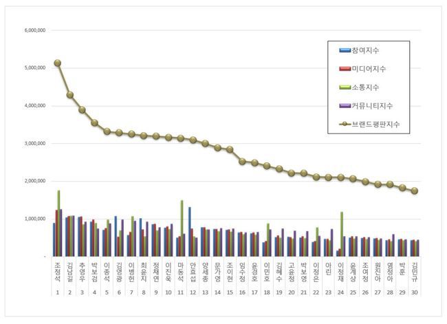 5위, 이종석 브랜드는 참여지수 705,322 미디어지수 750,879 소통지수 981,020 커뮤니티지수 883,346이 되면서 브랜드평판지수 3,320,567로 분석됐다.