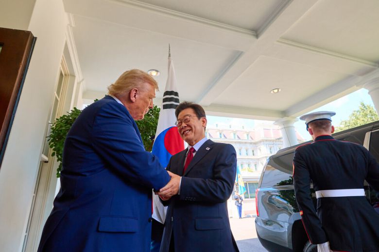 이재명 대통령이 25일(현지시각) 미국 워싱턴디시(DC) 백악관에서 영접나온 도널드 트럼프 미국 대통령과 악수하고 있다. 연합뉴스 |