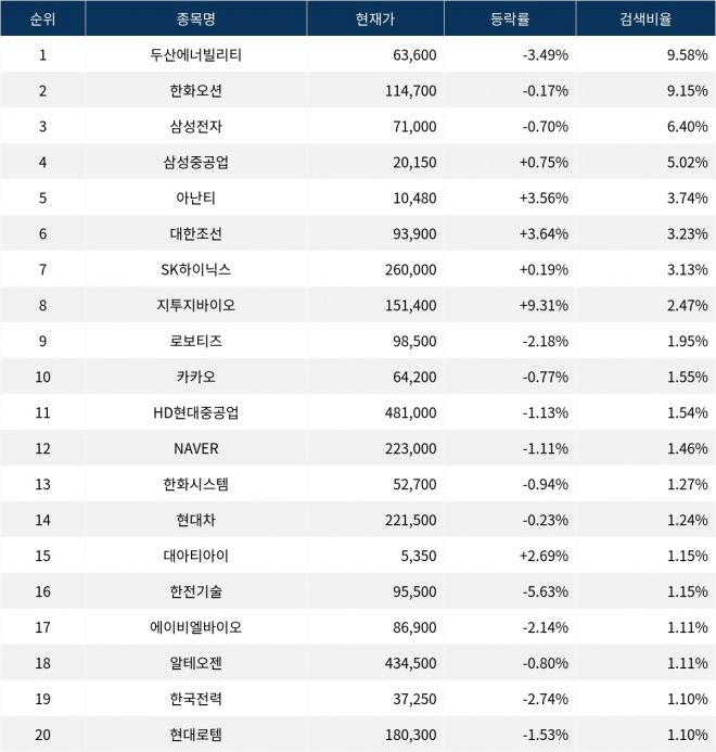 이어 한화오션(042660)이 검색비율 2위를 기록하며 0.17%의 하락세를 기록하고 있다. 검색비율 3위의 삼성전자(005930)는 0.70% 하락하며 출발했다. 검색비율 4위 삼성중공업(010140)은 개장 초반부터 0.75%의 상승률을 보이고 있다. 검색비율 5위 아난티(025980)는 3.56% 상승하며 강세를 보이고 있다.