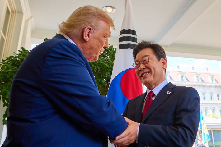 이재명 대통령이 25일(현지시간) 미국 워싱턴 DC 백악관에서 영접나온 도널드 트럼프 미국 대통령과 악수하고 있다. 연합뉴스 |