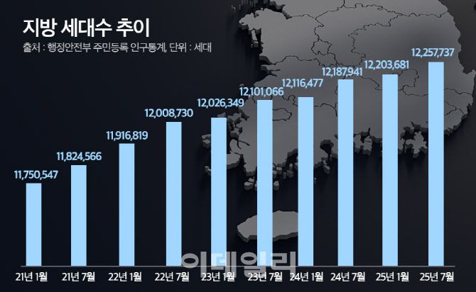 공급은 급감한 반면 수요는 꾸준히 증가하는 추세다. 행정안전부 주민등록 인구통계 자료에 따르면 지방(수도권 제외) 세대수는 2021년 1월 1175만 547가구에서 2025년 7월 기준 1225만 7737가구로 4년 반 만에 50만 가구 이상 증가한 것이다.