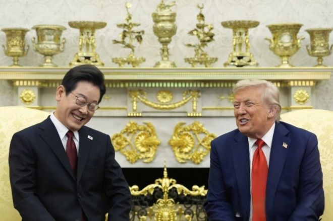 지난 25일(현지시간) 미국 백악관에서 열린 한미정상회담 도중 이재명(왼쪽) 대통령과 도널드 트럼프 미국 대통령이 함께 웃고 있다. 워싱턴 AP 연합뉴스 |