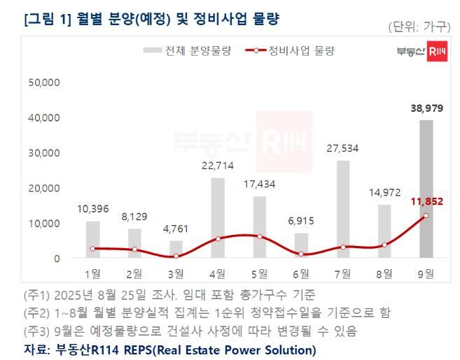 26일 부동산R114에 따르면 9월 전국 분양 예정 아파트는 53개 단지, 총 3만8979가구(임대 포함)로 조사됐다. 이 중 재개발·재건축 등 정비사업 물량은 1만1852가구로, 월간 전체 물량의 30%에 달한다. 이는 2023년 10월 이후 약 2년 만에 가장 많은 물량이다.