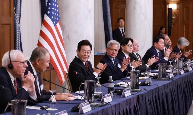 이재명 대통령이 25일(현지시간) 미국 워싱턴DC 윌라드 호텔에서 열린 한미 비즈니스 라운드 테이블에서 류진 한국경제인협회 회장의 발언 뒤 박수치고 있다. [사진=연합뉴스] |