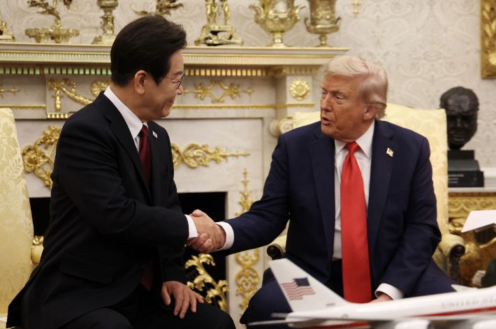 이재명 대통령과 도널드 트럼프 미 대통령이 25일(현지시간) 미국 워싱턴DC 백악관에서 정상회담 중 악수하고 있다. 연합뉴스