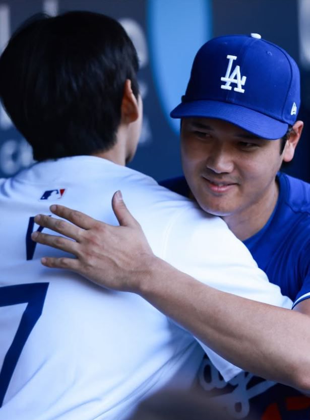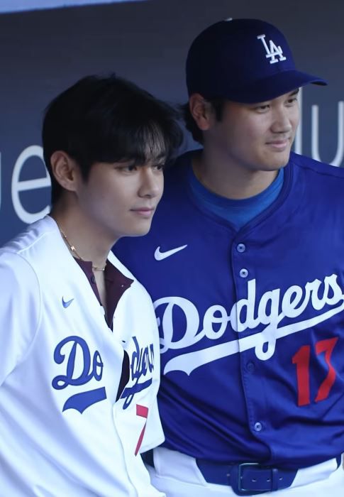사진 속 뷔는 다저스의 간판 투수 오타니와 만나 포옹하고 포즈를 취하는 등 훈훈함을 과시했다.