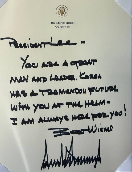 트럼프 대통령은 아울러 “당신은 위대한 지도자다. 한국은 당신과 함께 더 높은 곳에서 놀라운 미래를 갖게 될 것이다. 난 언제나 당신과 함께 있다”는 메시지를 직접 써서 이 대통령에게 건네기도 했다.