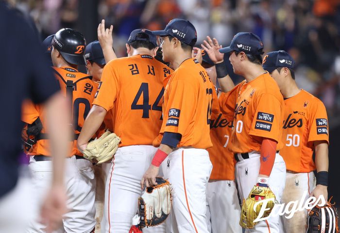 한화 선수들이 24일 대전 한화생명 볼파크에서 열린 2025 KBO리그 SSG전 승리 후 하이파이브를 하고 있다. 사진 | 한화 이글스 |