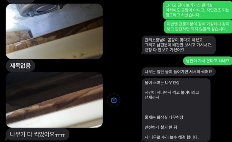 그럼에도 불구하고 아랫집은 “천장 나무가 젖었으니 인테리어 교체까지 해달라”며 공사를 요구했고, 관리소 측에서도 “왜 우리가 알려준 업체를 안 썼느냐”며 노발대발했다.