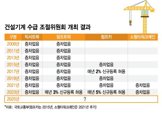 여기서 다루는 건 △레미콘 믹서트럭 △덤프트럭 △콘크리트 펌프카 △소형타워크레인 등 4개다. 그런데 제도 시행 이후 16년간 믹서트럭만 단 한차례도 증차가 허용되지 않았다.