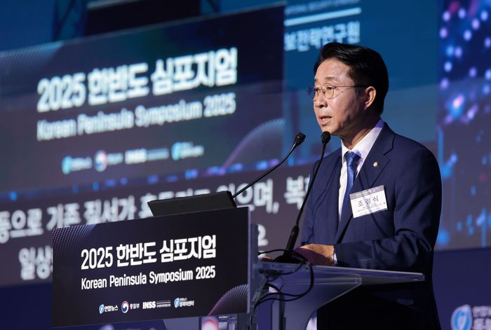 더불어민주당 외교안보통일자문회의 의장인 조정식 의원이 26일 서울 중구 신라호텔 다이너스티홀에서 열린 2025 한반도 심포지엄에서 기조연설을 하고 있다. 연합뉴스 |