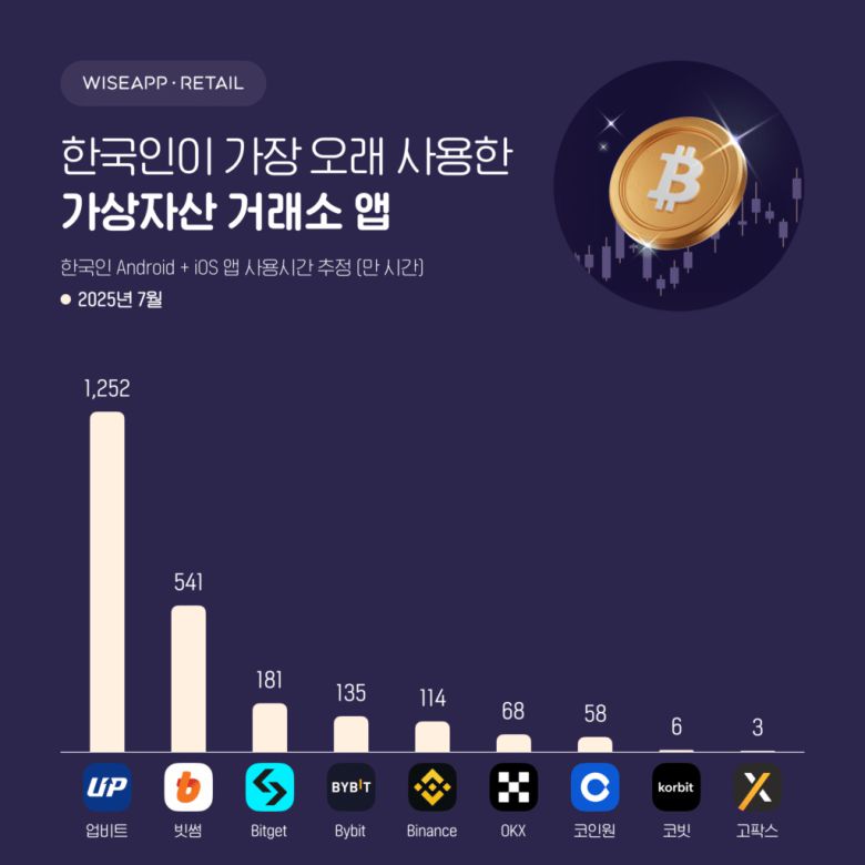 총 사용 시간 기준으로는 업비트가 1,252만 시간으로 압도적 1위를 기록했다. 빗썸이 541만 시간으로 2위, 비트겟이 181만 시간으로 3위를 차지했다. 바이비트 135만 시간, 바이낸스 114만 시간, OKX 68만 시간, 코인원 58만 시간, 코빗 6만 시간, 고팍스 3만 시간이 뒤를 이었다.