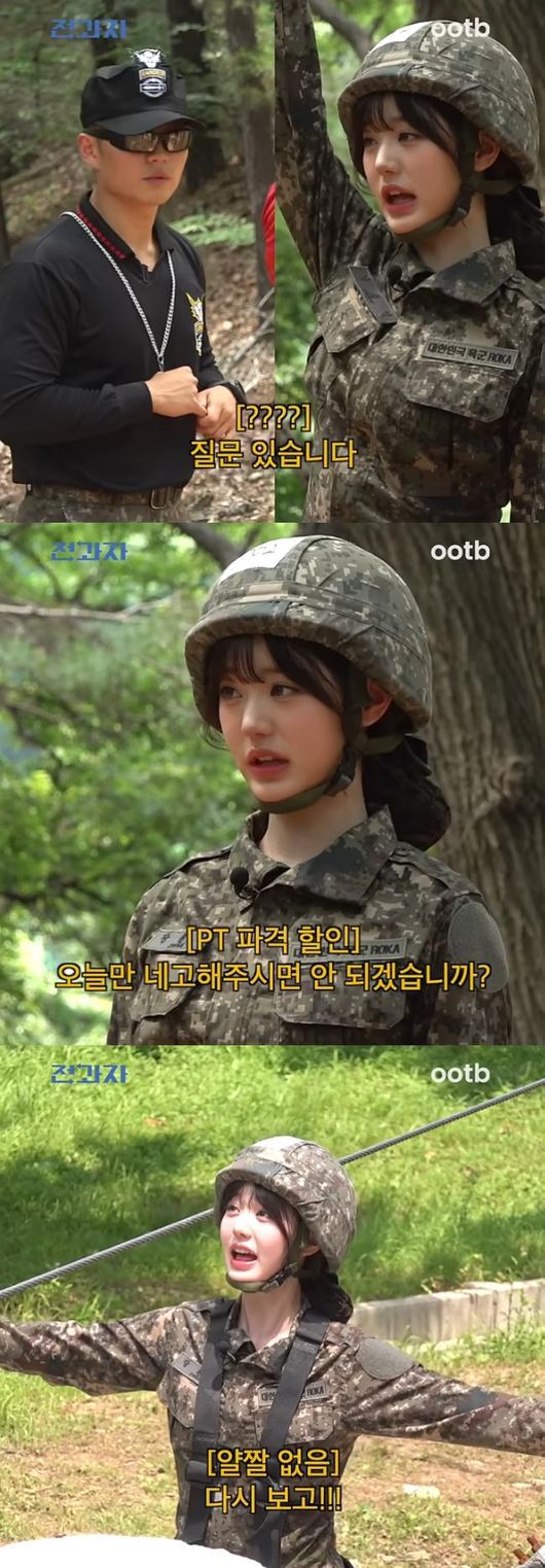 하지만 곧 장원영이 후회하는 모습이 예고됐다. 유격 훈련을 받게 된 장원영은 강도 높은 훈련에 지친 모습이었다. 장원영은 지친 표정으로 훈련을 받았고, 계속되는 고강도 훈련에 군 조교에게 “질문 있습니다. 혹시 몇 번까지 있나요?”라고 물었다. 조교가 14번까지 있다고 말하자 “오늘만 네고 해주시면 안 되겠습니까?”라고 협상에 들어가기도 했다.