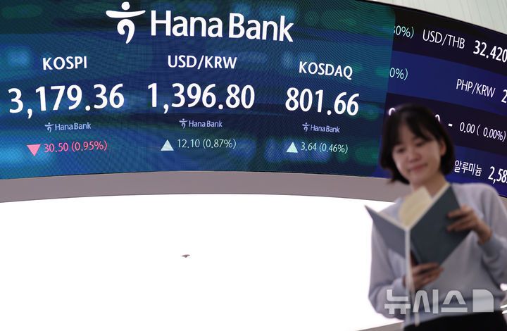 [서울=뉴시스] 배훈식 기자 = 미국 연준의 금리 인하 기대감 약화속에 외국인과 기관의 순매도가 이어진 26일 오후 서울 중구 하나은행 딜링룸 전광판에 코스피가 전 거래일 보다 30.50포인트(0.95%) 내린 3179.36 포인트를 나타내고 있다. 원달러 환율은 12.10원(0.88%) 오른 1396.80원, 코스닥 지수는 3.64포인트(0.46%) 오른 801.66 포인트. 2025.08.26. dahora83@newsis.com |
