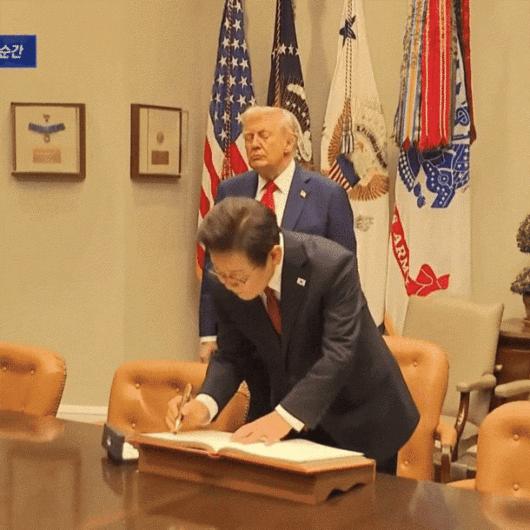 해당 게시글에는 이 대통령이 한미 정상회담 직전 백악관 방명록을 적자 트럼프 대통령은 이 대통령의 갈색 서명용 펜을 칭찬하는 모습이 담겨 있다. 당시 이재명 대통령은 트럼프 대통령이 “좋은 펜”이라고 거듭 말하자 “대통령님이 하는 사인에 유용할 것”이라며 즉석에서 이를 선물했다.