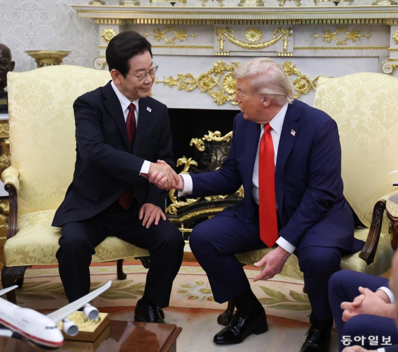 이재명 대통령과 도널드 트럼프 미국 대통령이 25일(현지시간) 워싱턴 백악관에서 한미 정상회담에 앞서 악수를 하고 있다. 워싱턴=송은석 기자 silverstone@donga.com