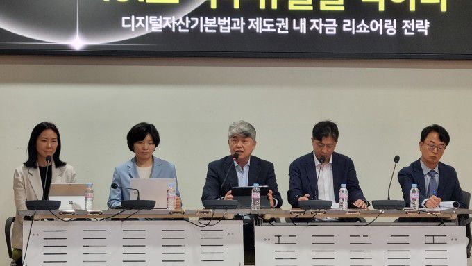 [서울=뉴스핌] 전미옥 기자 =26일 열린 '디지털자산기본법과 제도권 내 자금 리쇼어링 전략' 토론회에서 전문가들의 논의가 이어졌다. 왼쪽부터 강현정 김앤장 변호사, 김재진 DAXA 상임부회장, 류혁선 카이스트 교수, 이주현 빗썸 전략법무실장, 이해붕 업비트 투자자보호센터장. 2025.08.26 romeok@newspim.com |