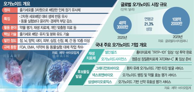 26일 시장조사기관 더 글로벌리서치컴퍼니에 따르면 오가노이드 시장은 올해 48억 3000만 달러에서 연평균 21.3% 성장해 2029년 108억 2000만 달러에 달할 것으로 전망된다. 오가노이드는 사람 세포를 분화 시킨 3차원의 인공 장기(미니장기)로 2009년 학계에 처음 보고됐다. 실제 인체 조직을 모사한 만큼 이식 시 기존 치료제 대비 부작용이 적고 전임상에서 약물 반응을 반복적·장기적으로 관찰할 수 있는 것이 장점이다. 장기 이식 가능성에 의료계의 관심이 커졌지만 혈관화, 면역 적합성 등 기술 문제로 아직까지는 실험실 수준에 머물러 있어 산업적 성장은 더딘 상황이었다.