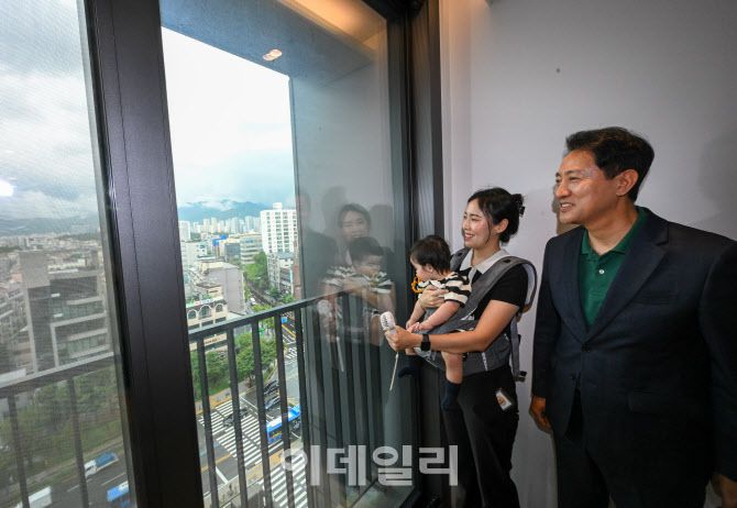 오세훈 서울시장이 지난 13일 서울 송파구 문정동 ‘비아파트형 미리내집’ 르피에드 주거용오피스텔을 서울 베이비 엠버서더와 함께 방문하고 있다. (사진=이영훈 기자) |