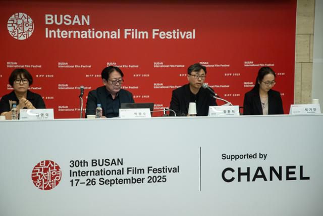 김영덕 부산국제영화제 마켓위원장(왼쪽부터), 박광수 이사장, 정한석 집행위원장, 박가언 수석 프로그래머가 26일 서울 중구 대한상공회의소에서 열린 제30회 부산국제영화제 개최 기자회견에서 인사말을 하고 있다. 연합뉴스