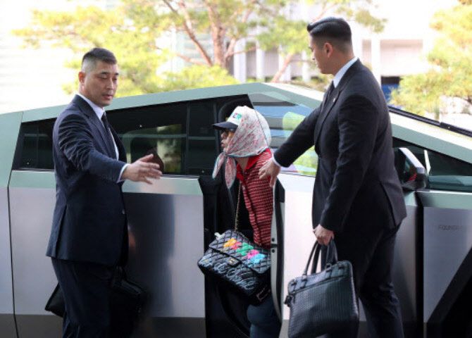 가수 지드래곤(GD)이 테슬라의 전기 픽업트럭 ‘사이버트럭(Cybertruck)’에서 하차하고 있다.(사진=뉴스1) |