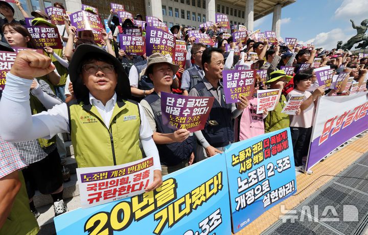 [서울=뉴시스] 조성우 기자 = 민주노총 전국건설산업노동조합연맹 조합원들이 22일 오전 서울 여의도 국회 본청 앞 계단에서 열린 '단 한글자도 바꿀 수 없다' 노조법 2.3조 개정안 통과 촉구 기자회견에서 구호를 외치고 있다. 2025.08.22. xconfind@newsis.com