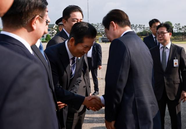 일본·미국 순방에 나서는 이재명 대통령이 23일 성남 서울공항에서 환송 나온 정청래(왼쪽) 더불어민주당 대표와 악수하고 있다. 연합뉴스 |
