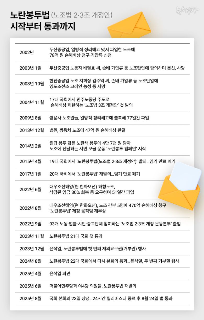 노동자들을 죽음으로 내몬 ‘손배 가압류’ 문제를 해결해야 한다는 목소리가 커지면서 이듬해인 2004년 11월, 기업의 손해배상 청구를 제한하는 내용이 담긴 노조법 3조 개정안이 처음 국회에 발의됐다. 아직 ‘노란봉투법’이란 이름이 붙기 전이었다.