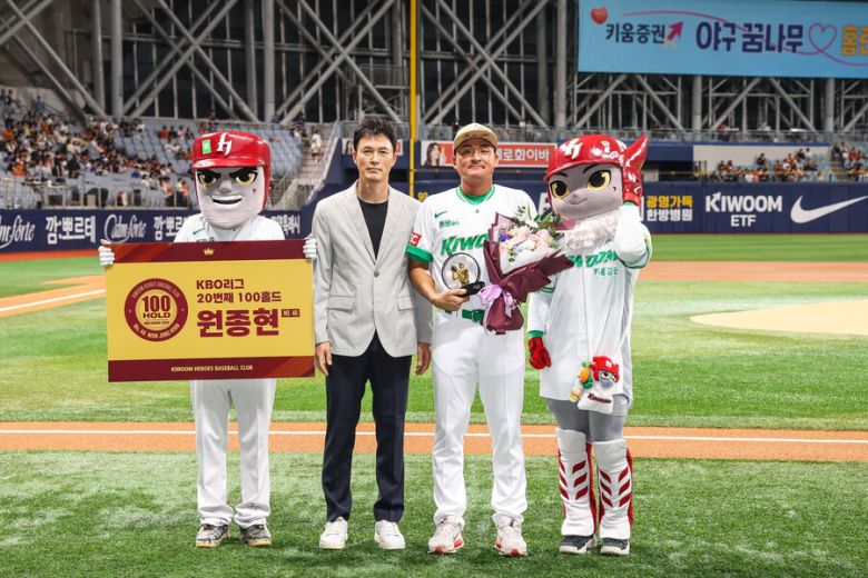 [스포티비뉴스=신원철 기자] 키움 히어로즈는 26일 서울 고척스카이돔에서 열리고 있는 한화 이글스와 경기에 앞서 투수 원종현의 KBO리그 역대 20번째 100홀드 달성을 기념하는 시상식을 실시했다.
