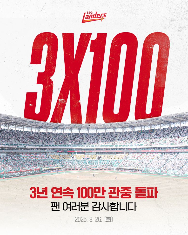 SSG는 이날 경기 전까지 99만1765명의 누적 관중을 기록했다. 사전 예매분을 포함해 이미 100만 관중을 돌파했다. 2023년(106만 8211명), 2024년(114만 3773명)에 이어 3년 연속 100만 관중을 넘어섰다. SSG는 물론 인천 연고 구단 역사상 최초의 기록이다.