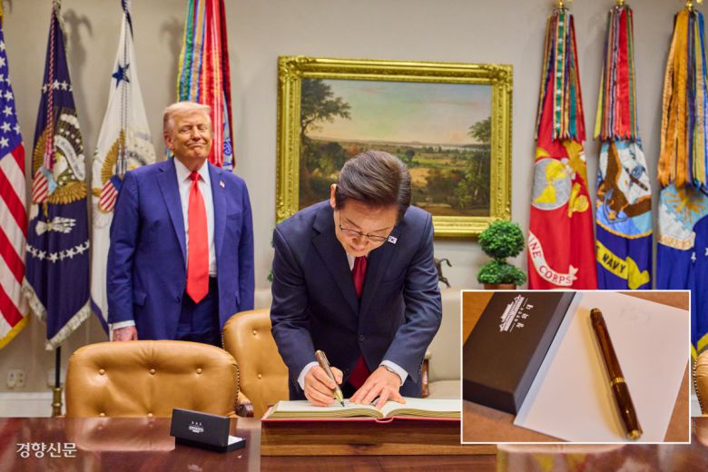 이 대통령이 방명록에 “한·미 동맹의 황금시대 강하고 위대한 미래가 새로 시작됩니다”라고 쓴 뒤부터 얼어 있던 분위기는 서서히 녹기 시작했다. “영어와 한국어 중 어느 언어가 정확하다고 생각하느냐”고 물으며 대화를 시작한 트럼프 대통령은 이 대통령이 서명할 때 사용한 대통령실 제작 펜을 보면서 “두께가 굉장히 마음에 든다”며 관심을 보였다. 트럼프 대통령이 “가져갈 거냐”라고 묻자, 이 대통령은 즉석에서 선물로 증정했다.