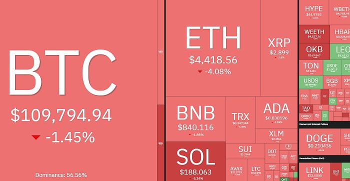 [디지털투데이 AI리포터] 암호화폐 시장이 비트코인의 급락을 중심으로 공포에 휩싸였다. 비트코인(BTC)은 전일 대비 1.45% 하락한 10만9794달러에 거래되며 오랜 시간 지켜왔던 11만달러 지지선마저 무너졌다. 시장점유율은 56.56%로 소폭 하락했으나, 이는 시장의 전반적인 투매 양상 속에서 알트코인들의 하락 폭이 더욱 컸기 때문으로 분석된다.