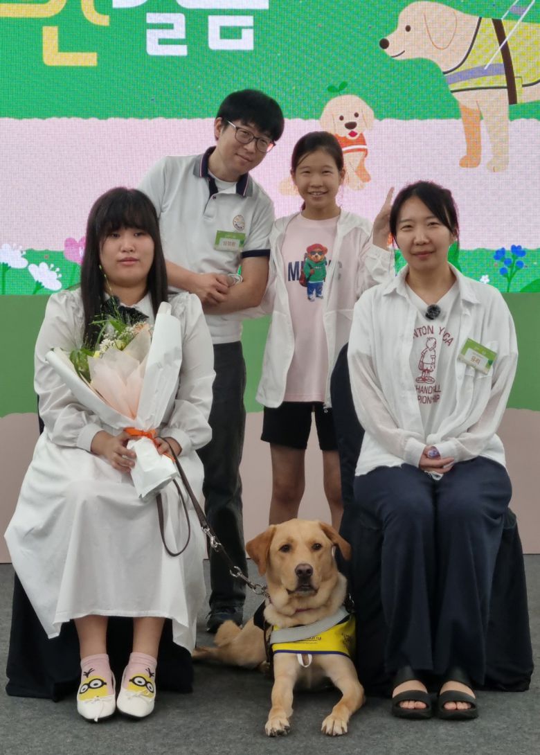 태극이 파트너 도지우씨, 퍼피워커로 활동했던 임정환씨, 임소예양, 유리씨(왼쪽부터 시계방향)가 26일 삼성화재 안내견학교 32주년 기념식에서 기념촬영을 하고 있다. |
