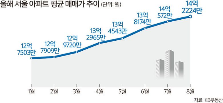 서울 아파트 평균매매가격이 고공행진을 지속하면서 전국 아파트 평균 가격과의 격차가 또다시 역대 최대치를 경신한 것으로 나타났다. 경기권 평균 아파트 매매가보다도 9억원 가까이 높은 수준을 이어가며 주택시장에서의 ‘서울 쏠림’ 현상은 갈수록 심화하는 양상이다. ‘똘똘한 한 채’ 선호와 인구 감소 등에 따른 지방 부동산 시장 위축이 서울 아파트값 상승을 공고히 했다는 평가가 나온다.