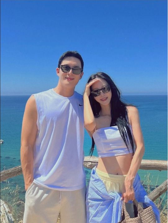 이어 공개된 커플샷에서는 선글라스를 착용한 두 사람이 푸른 바다를 배경으로 다정하게 포즈를 취하고 있어 눈길을 끌었다. 한예슬은 크롭톱과 랩스커트 스타일링으로 세련된 휴양지 패션을 완성하며 특유의 매력을 발산했다.