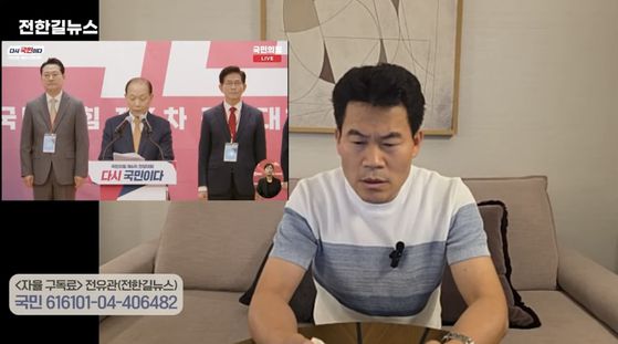극우 유튜버 전한길씨가 26일 국민의힘 전당대회에서 탈락한 김문수 후보를 향해 정계 은퇴를 요구했다. 유튜브 캡처
