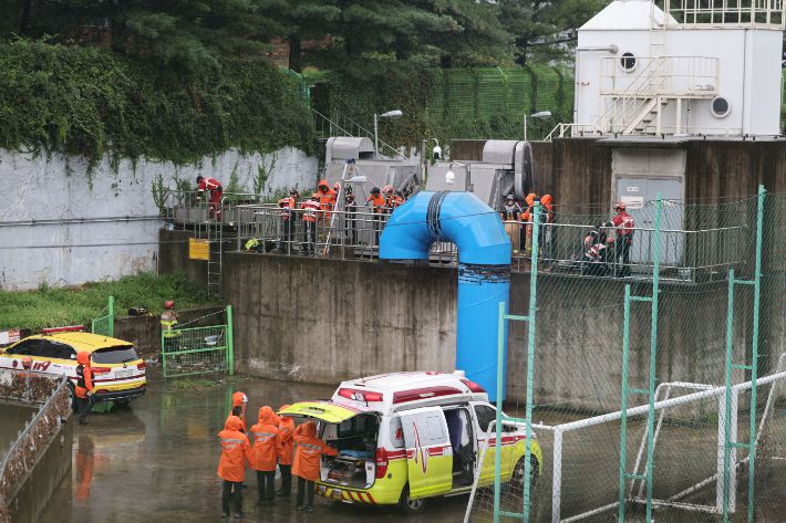 25일 서울 강서구 가양빗물펌프장에서 소방 관계자들이 수습 작업을 벌이고 있다. 연합뉴스