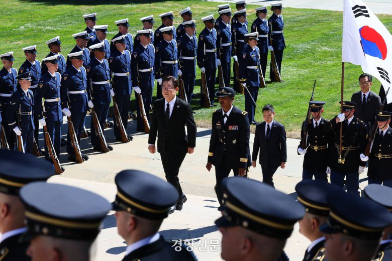 이 대통령은 미군 의장대와 군악대가 도열해 있는 가운데 알링턴 국립묘지에 입장했다. 국가원수에 대한 예우의 의미를 담은 예포 21발이 발사됐다.
