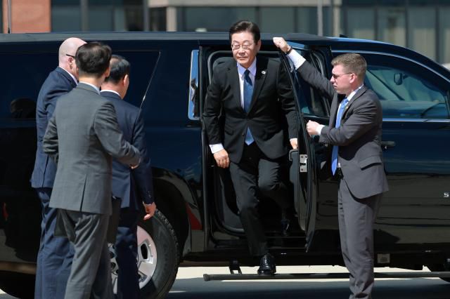한미 정상회담 등 워싱턴 일정을 마치고 필라델피아로 향하는 이재명 대통령이 26일(현지시간) 미국 워싱턴DC 인근 앤드루스 합동기지에 도착해 차량에서 내리고 있다. [사진=연합뉴스>] |