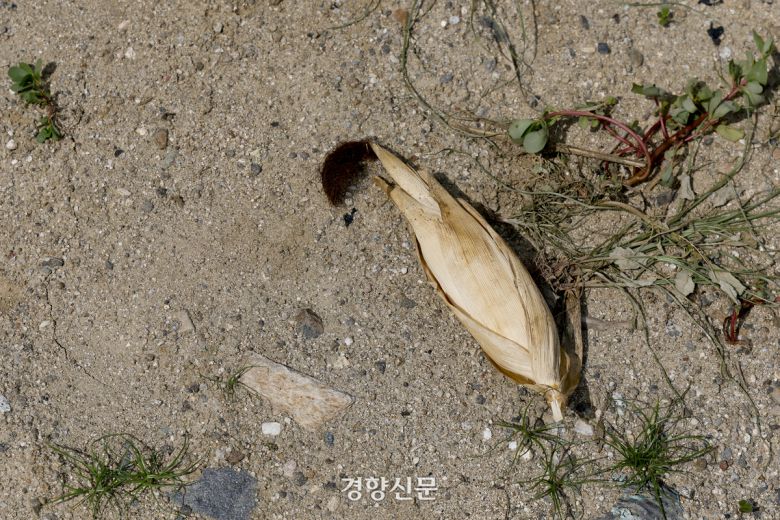 강원도 강릉시의 주요 상수원인 오봉저수지 저수율이 극심한 가뭄으로 역대 최저치를 기록하고 있다. 지난 20일 강릉시는 오전 9시를 기해 계량기 50%를 잠그는 제한급수에 들어갔다. 제한급수 이틀차인 21일 강원 강릉시 오봉저수지 인근 민가에 말라버린 옥수수가 땅에 떨어져 있다. 문재원 기자 |