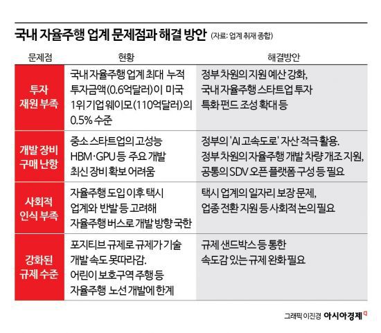 국내 자율주행 업계는 자금 부족과 포지티브 방식의 규제 환경, 자율주행에 대한 일반인들의 부정적 인식 등의 어려움을 호소하고 있다. 맞춤형 기술 지원을 마련하거나 정부 주도로 진행되는 인공지능(AI) 분야에 참여할 수 있는 방안을 마련해 사업을 영위할 수 있는 기반이 필요하다고 입을 모은다.