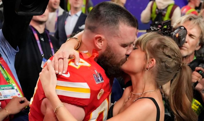 테일러 스위프트(오른쪽)가 2024년 2월 네바다주 라스베이거스에서 열린 슈퍼볼에서 우승한 남자친구 트래비스 켈시와 입을 맞추고 있다. [AP] |