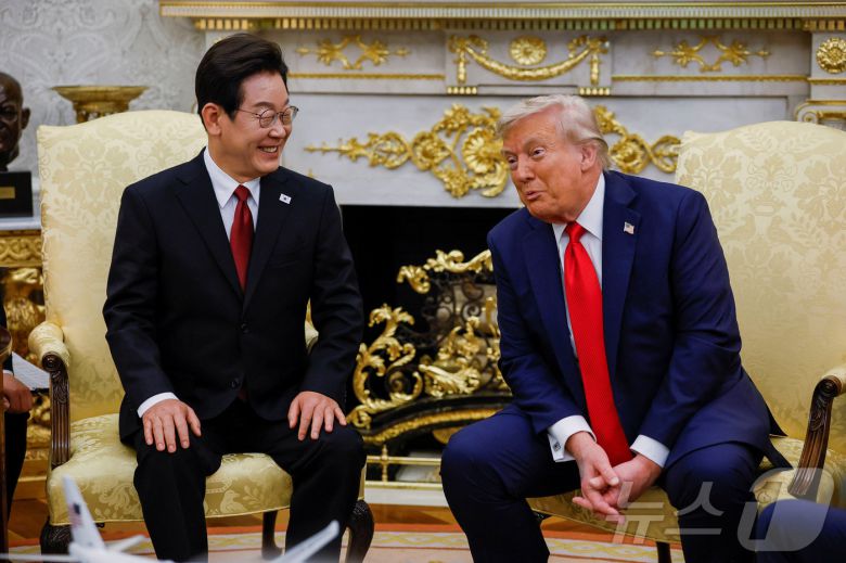 이재명 대통령이 25일(현지시간) 미국 워싱턴 백악관에서 도널드 트럼프 대통령과 한미 정상회담을 하고 있다. ⓒ 로이터=뉴스1 ⓒ News1 신웅수 기자
