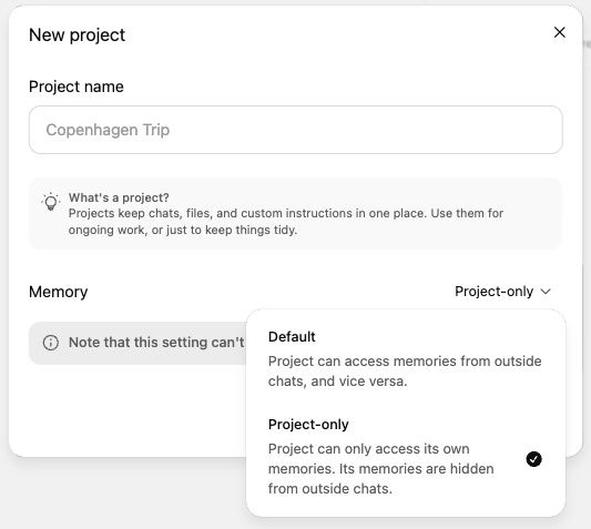특히 프로젝트 내에서만 유효한 메모리를 설정할 수 있어, 특정 작업이 다른 대화에 영향을 미치지 않도록 했다. 이를 통해, 프로젝트별로 독립적인 메모리를 유지할 수 있으며, 기존 챗GPT 대화와의 간섭을 최소화할 수 있다. 사용자는 웹 인터페이스에서 '새 프로젝트'를 클릭한 후, '기본 메모리'를 '프로젝트 전용'으로 변경하면 이 기능을 활성화할 수 있다.