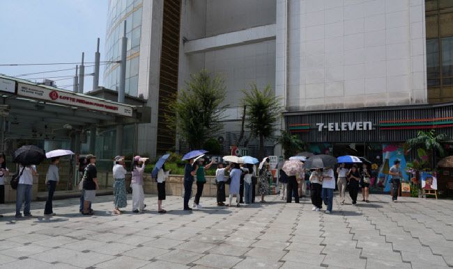지난달 28일 세븐일레븐이 배우 하정우와 협업해 선보인 아트와인 ‘마키키 쇼비뇽블랑’ 첫 줄시 당시 모습. 굿즈 증정 등 이벤트에 사람들의 줄이 늘어서있다. (사진=세븐일레븐) |
